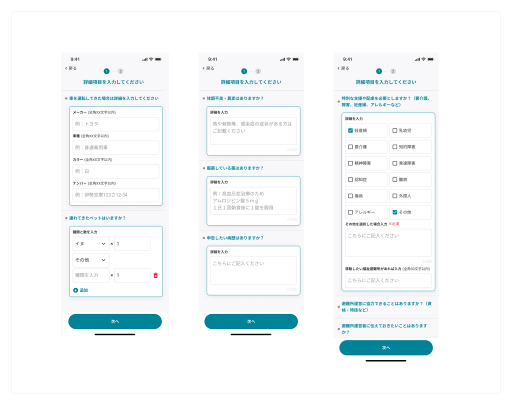 今回は、避難所マネジメントシステムに新たに追加された「詳細項目」(例:自家用車の使用有無、健康状態の申告、緊急連絡先など)を、Webフォーム、アプリ※、職員による手入力といった多様な入所経路から取得できるようになりました。さらに、自治体によって、項目ごとに利用の有無を管理画面から柔軟に設定できるようになっており、各自治体の運用方針や地域特性に応じた柔軟な項目管理が可能となりました。これにより、不要な項目の非表示や、必要な情報の重点的な収集が行えるようになり、住民にとっても回答負荷を軽減しつつ、自治体側はより効率的で的確な情報取得・管理が実現できます。