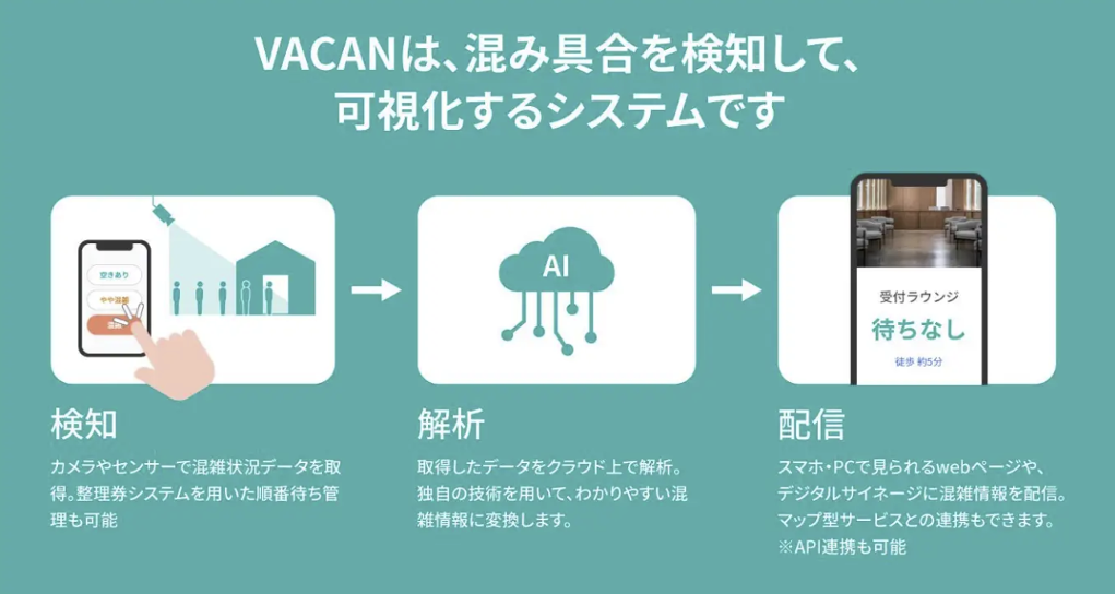 VACANでは様々な方法で空きや混雑を検知/配信できますが、今回は専用ページから混雑状況をスタッフが入力する方法で可視化をおこないます。事前に導入工事などが必要なく、素早くかつ簡単に混雑の可視化が可能となっています。