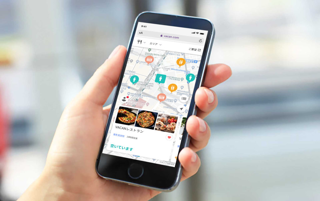 VACANには、マップ上で近くの施設等の空き・混雑状況を一覧表示できる「VACAN Maps」(https://vacan.com)という機能があり、来場者はこのVACAN Mapsにスマートフォン等でアクセスすることで、飲食店の位置や混み具合を地図上から確認できます。混雑状況は「空きあり」「やや混雑」「混雑」「満」「〜分以上待ち(5〜180分)」の5段階で表示され、リアルタイムの混雑度を地図上で一目で把握することが可能です。