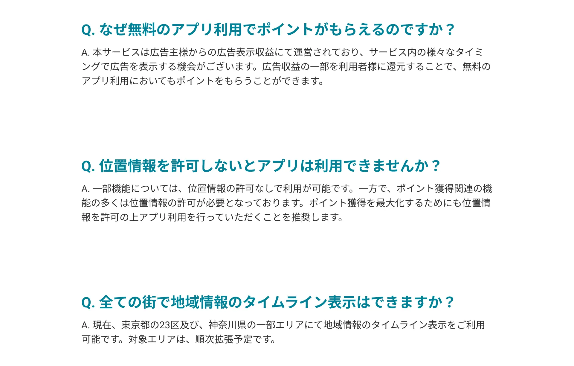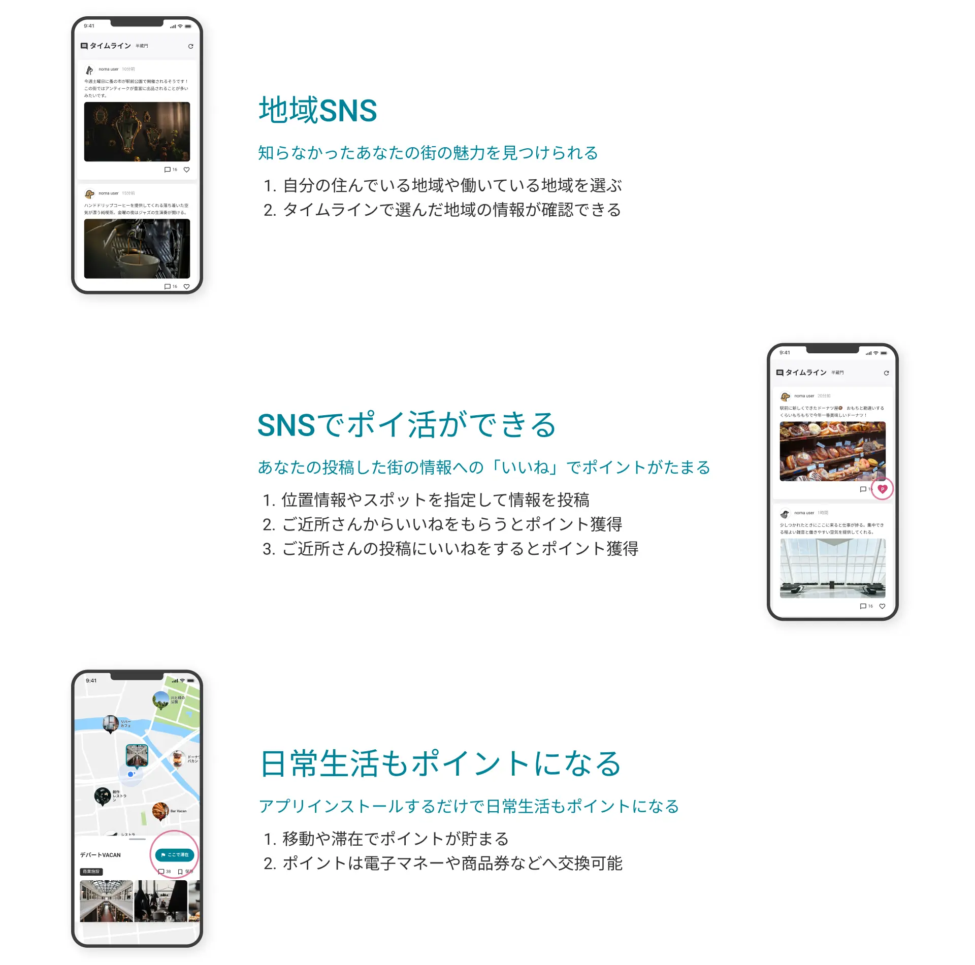 地域SNS:知らなかった、あなたの街の魅力を見つけられる。自分の住んでいる地域や働いている地域を選ぶ。タイムラインで選んだ地域の情報が確認できる。SNSでポイ活ができる:あなたの投稿した街の情報への「いいね」でポイントがたまる。位置情報やスポットを指定して情報を投稿。ご近所さんからいいねをもらうとポイント獲得。