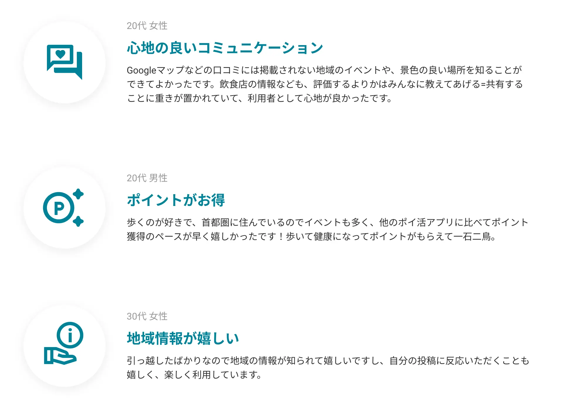 20代 女性:心地の良いコミュニケーション。Googleマップなどの口コミには掲載されない地域のイベントや、景色の良い場所を知ることができてよかったです。飲食店の情報なども、評価するよりかはみんなに教えてあげる=共有することに重きが置かれていて、利用者として心地が良かったです。20代 男性:ポイントがお得。歩くのが好きで、首都圏に住んでいるのでイベントも多く、他のポイ活アプリに比べてポイント獲得のペースが早く嬉しかったです!歩いて健康になってポイントがもらえて一石二鳥。30代 女性:地域情報が嬉しい。引っ越したばかりなので地域の情報が知られて嬉しいですし、自分の投稿に反応いただくことも嬉しく、楽しく利用しています。